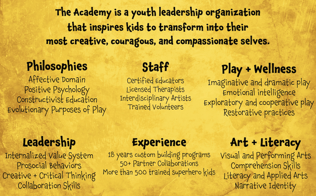 In a true “hero’s journey”, kids enter into a special world of imagination and play to access their most inspirational vision of themselves. Through a literacy immersion, contemplation, creative arts, and character building adventure challenges, kids imagine and design themselves into a real life superhero.